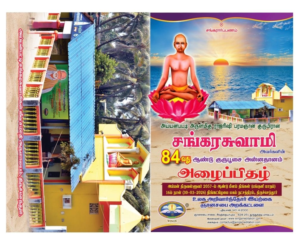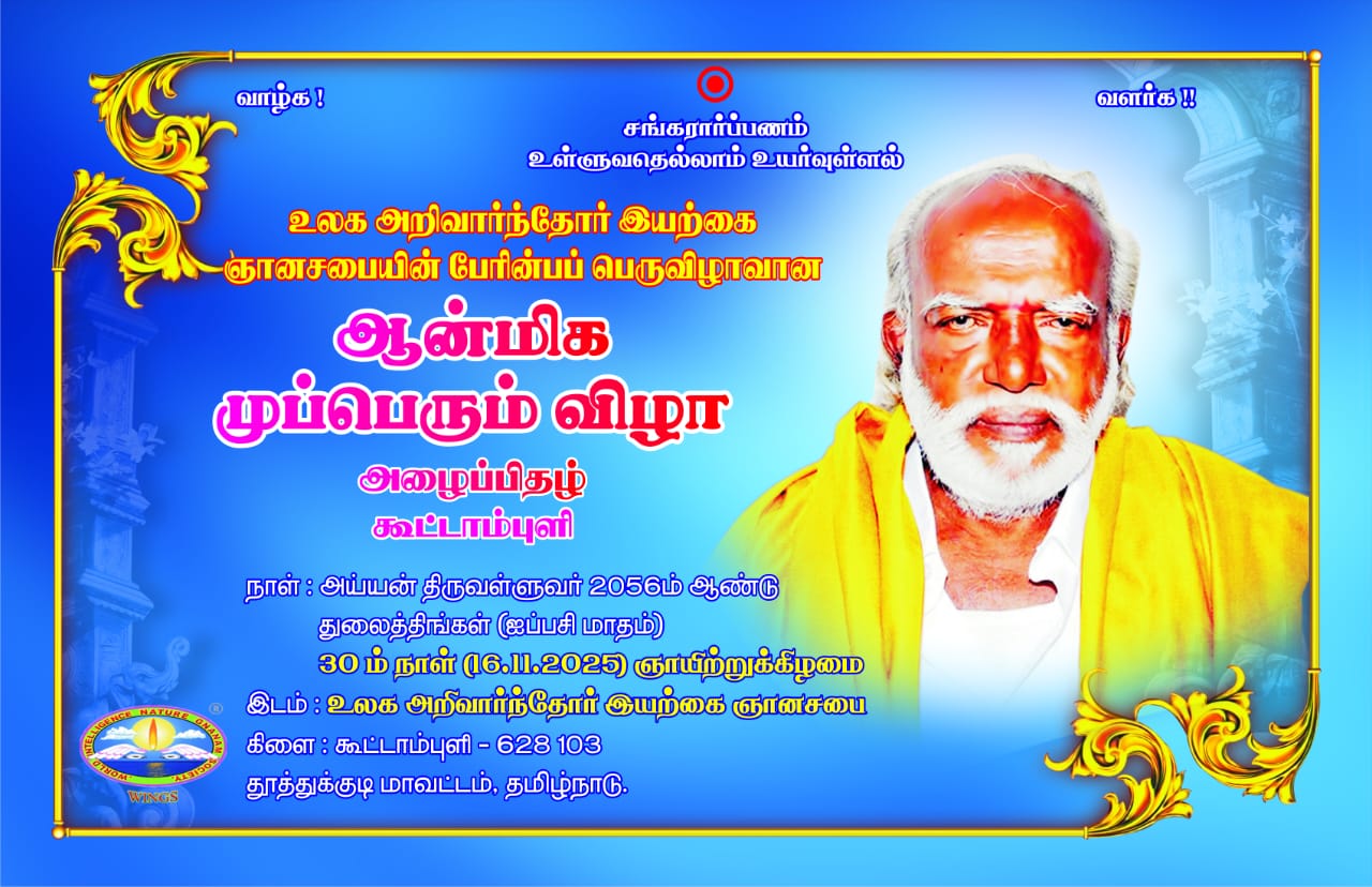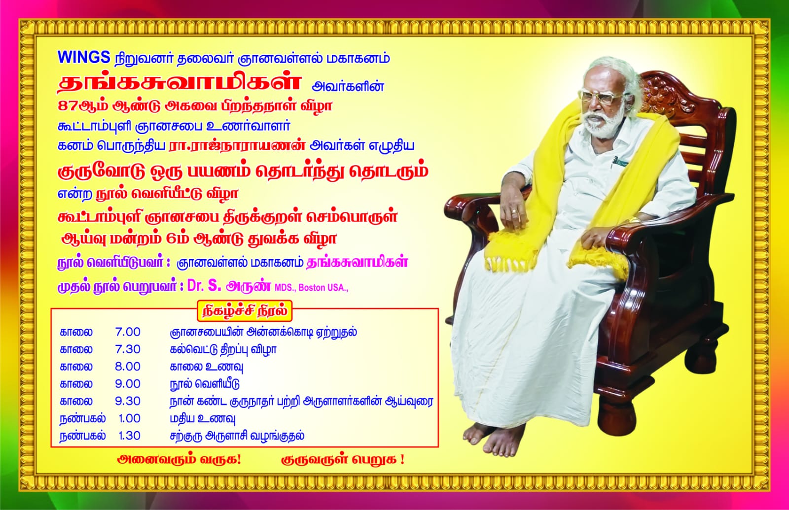 WINGS நிறுவனத் தலைவர் ஞானவள்ளல் மகாகனம் தங்கசுவாமிகள் அவர்களின் 87-வது பிறந்தநாள் விழா, கூட்டாம்புளி ஞானசபை உணர்வாளர் கனம் பொருந்திய ரா.ராஜ்நாராயணன் அவர்கள் எழுதிய 'குருவோடு ஒரு பயணம் தொடர்ந்து தொடரும்' என்ற நூலின் வெளியீட்டு விழா மற்றும் கூட்டாம்புளி ஞானசபைத் திருக்குறள் செம்பொருள் ஆய்வு மன்றத்தின் 6-ம் ஆண்டு துவக்க விழா ஆகியவை நடைபெறும்.